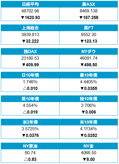 昨日のドル/円は終値ベースで約0.2%上昇。日銀の追加利上げ観測の後退や、高市政権の大型補正予算による日本の財政悪化懸念を背景に円売りが優勢となり、一時155.74円前後まで上昇した。なお、米ADPが発表した週次の雇用報告では11月1日までの4週間で民間雇用者数が週平均2500人減少していたが、雇用減少のペースは前週までと比べて鈍化していた。 高市政権の経済対策について、一部議員からは「25兆円規模を求められた」と報じられるなど、当初報じられていた17兆円規模から規模が拡大するとの懸念が広がっている。本日は財務省が20年債の入札を予定していることから、結果次第では債券売り・日本株売り・円売り(日本売り)が加速する可能性があるため注意したい。一方で、昨日は片山財務相が為替動向について「憂慮している」と語り、これまでよりも表現を強めて市場をけん制しているため、円買い介入への警戒感から円安のスピードは抑えられやすくなっている。本日もドル/円はじりじりと上値を模索する展開となりそうだ。なお、明朝には米半導体大手のエヌビディアが8-10月期決算発表をする。同期間中に著名投資家が率いるヘッジファンドやソフトバンクグループが保有するエヌビディア株を全株売却していたと報じられる中、決算結果に注目が集まっている。