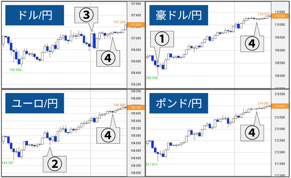 主要通貨ペア(ドル/円、ユーロ/円、豪ドル/円、ポンド/円)について前営業日の値動きをわかりやすく解説し、今後の見通しをお届けします。