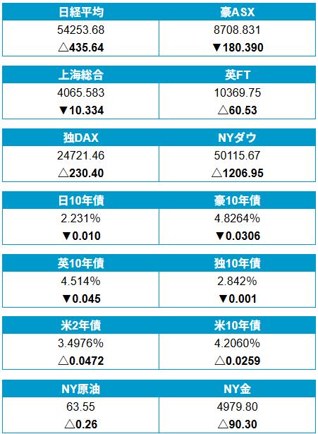 NYダウ平均株価が史上初めて5万ドルの大台に乗せて上昇。AI向けの過剰投資をめぐる懸念が和らぎ市場心理が改善した。