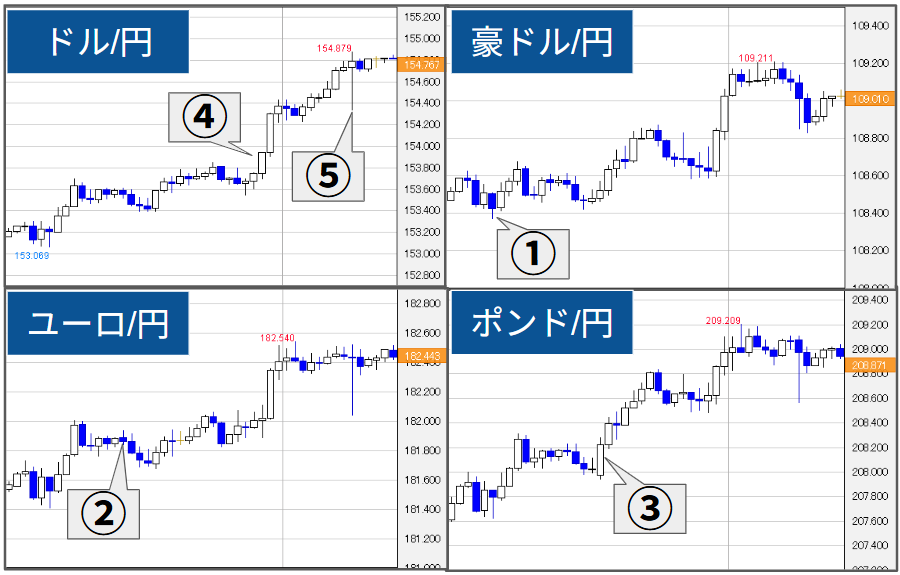 主要通貨ペア(ドル/円、ユーロ/円、豪ドル/円、ポンド/円)について前営業日の値動きをわかりやすく解説し、今後の見通しをお届けします。