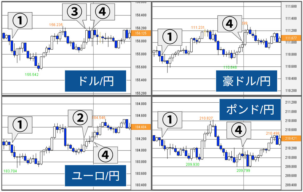 主要通貨ペア(ドル/円、ユーロ/円、豪ドル/円、ポンド/円)について前営業日の値動きをわかりやすく解説し、今後の見通しをお届けします。