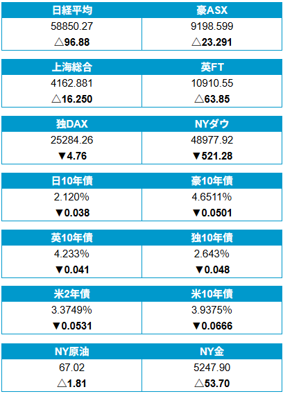 米国株が寄り付きと同時に下落。米プライべートクレジット(ノンバンク融資)市場において、借り手である新興企業の債務不履行(デフォルト)が増加するとの観測や、米国とイランの軍事衝突リスクが重しとなった。なお、ルビオ米国務長官はこの日、イランを「不当拘束支援国家」に指定すると発表。米国民に対し、いかなる理由であれイランに渡航しないよう勧告し、イラン国内にとどまっている米国人に対しては、直ちに退去するようあらためて求めた。25日に破綻した英住宅ローン会社マーケット・フィナンシャル・ソリューションズ(MFS)を巡り、英バークレーズや米ウェルズファーゴなどの大手金融機関が同社に関与していたとの観測が浮上したことも相まって、週末を前に投資家の持ち株を処分する動きが強まった。